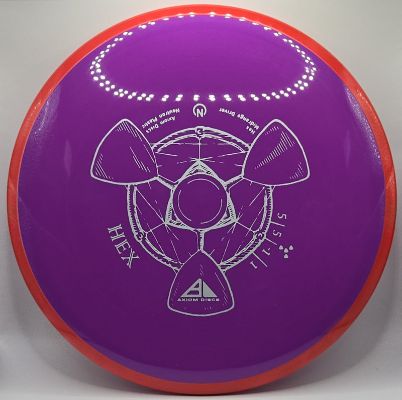 The Neutron Hex by Axiom is a straight flying midrange designed with all skill levels in mind this disc is usually a staple in MVP/Axiom favored players. It has been compared to the Buzzz by Discraft with extra glide.