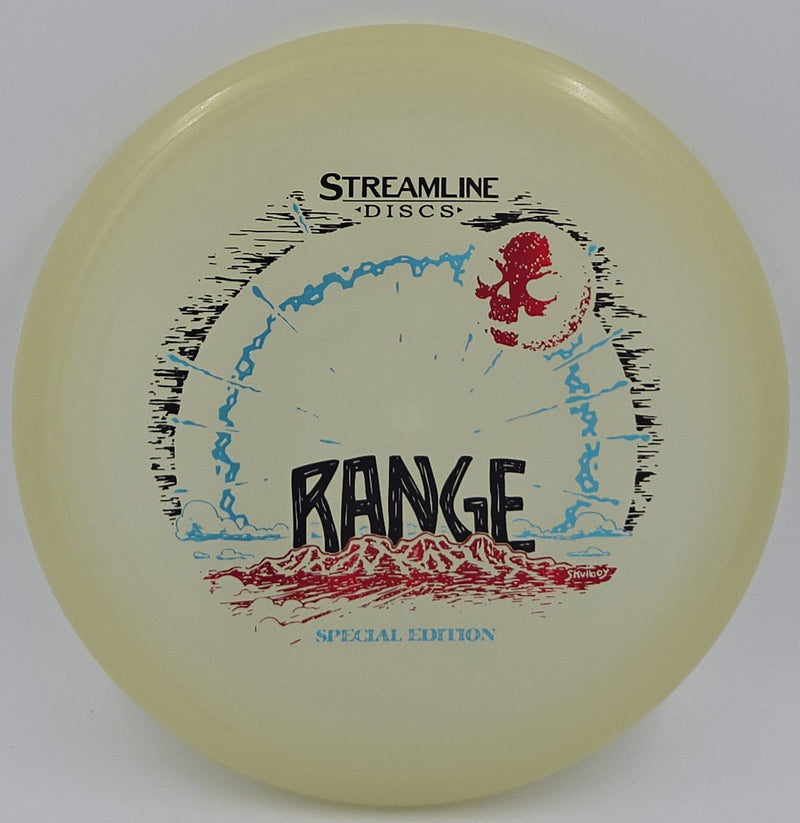 Streamline's Eclipse Range is a putt and approach disc now featured in some of the brightest glow plastic on the market. The profile design limits glide while still being super torque resistant. Streamline describes this disc as a "straight-flyer with subtle but reliable fade" The Special Edition version features artwork by Skulboy.